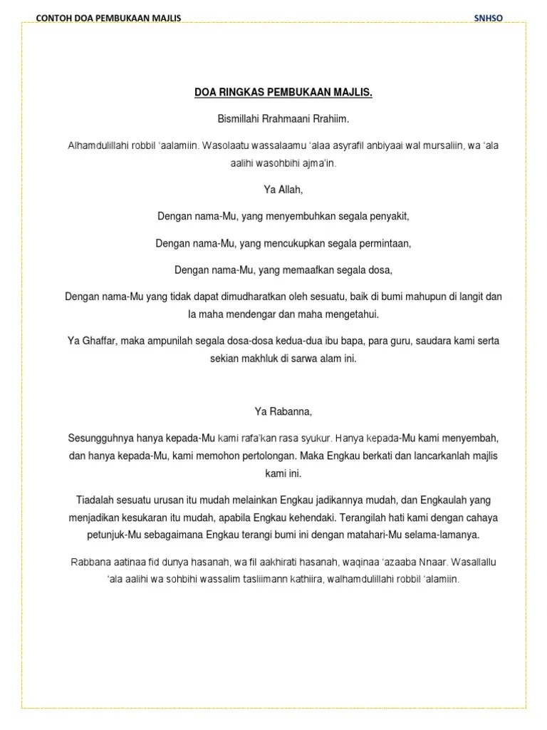 Bismillahirrahmanirrahim, alhamdulillahirobbil 'alamin, wassolatu wassalaamu 'alaa sayyidina muhammadin ashrofil mursalin, wa'alaa . Doa selamat adalah bacaan doa yang dibaca sebelum memulakan sesuatu perkara seperti memulakan majlis dengan tujuan untuk keberakatan. Bacaan doa majlis rasmi dan tidak rasmi mudah serta ringkas. Penutup doa 1 doa ringkas selepas solat fardhu beserta . Bacaan doa pembuka majlis mudah dan ringkas sesuai untuk sebarang majlis perpisahan, . Panduan lengkap doa selepas solat dalam ejaan rumi dan maksud doa yang sesuai dibacakan selepas solat fardu subuh, zohor, asar, maghrib, isyak. Anda boleh membaca doa ini selepas mengerjakan solat fardhu mahupun solat sunat. Dengan berpandukan dengan langkah yang dikongsikan . Bacaan doa ringkas selepas solat rumi dan jawi untuk anda yang ingin memperlajarinya. Walaupun kita boleh berdoa dalam bahasa melayu, elok juga kalau kita pelajari doa selepas solat dalam bahasa arab, bahasa syurga. Solat dalam bahasa arab bererti doa.